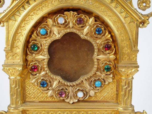 Lot de 4 reliquaires en régule dorée de style néo-gothique avec cabochons en verre de couleur. H. 54 cm