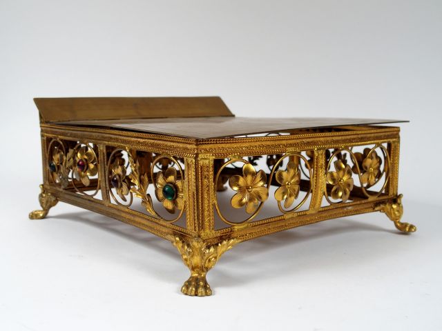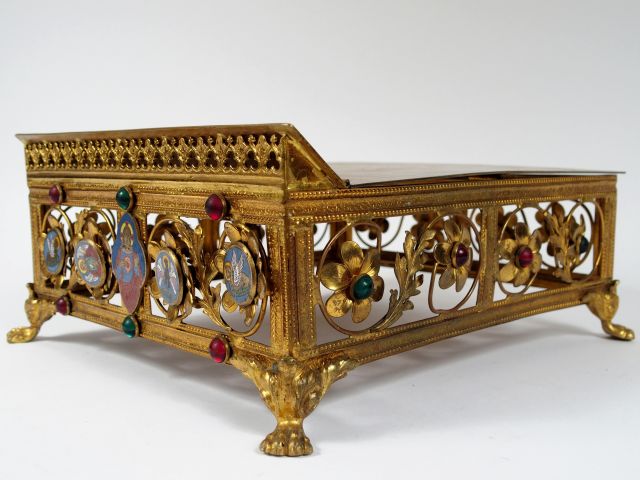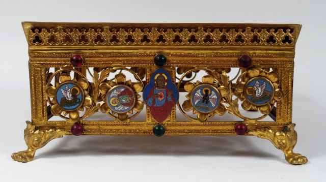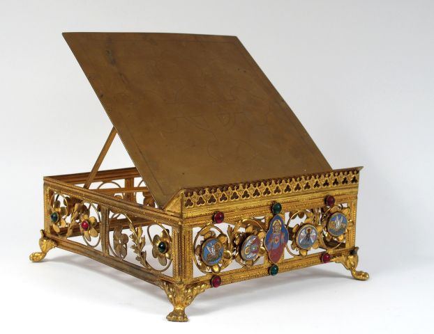Lutrin en métal doré, émaux closonnés à décor du Christ en majesté entouré du tétramorphe , verroterie de couleur
