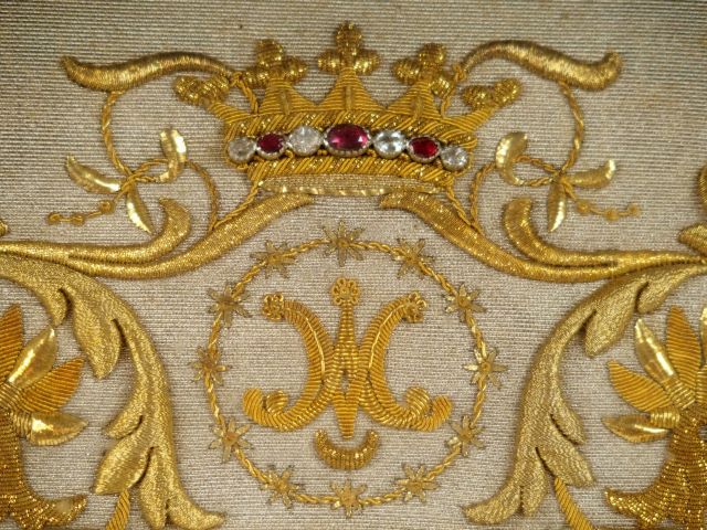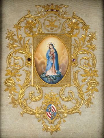 Soie brodée de fils d'or et d'argent entourant une miniature figurant l'immaculée conception, signée et datée 1860. 39 x 28,5 cm. Lettre manuscrite précisant que cette soie brodée a appartenu au pape Pie IX qui "pour subvenir à sa détresse le mit en loterie avec d'autres objets"