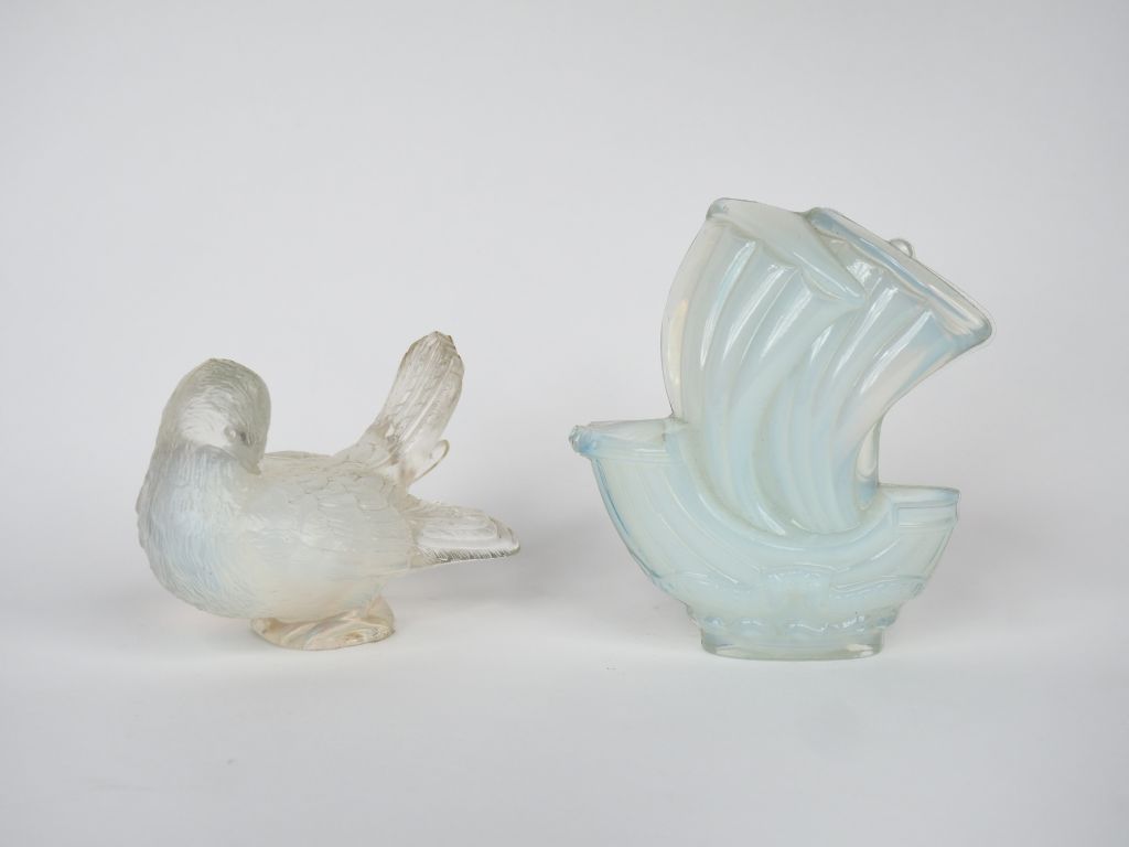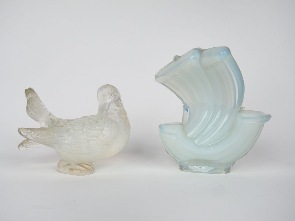 Lot de 2 sujets en verre opalescent "Colombe" et "Allégorie de la ville de Pa au prix de 30 à 50 € en vente aux enchères par l'hôtel des ventes Primardeco