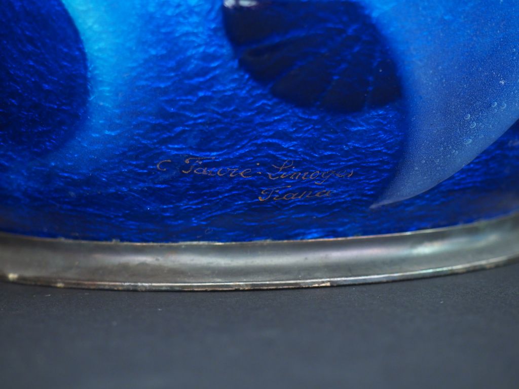 Camille FAURE à Limoges. Vase ovoide Art Déco en émaux, en camaieu de bleu rehaussé d'or , monté en lampe. Signé H. 30 cm