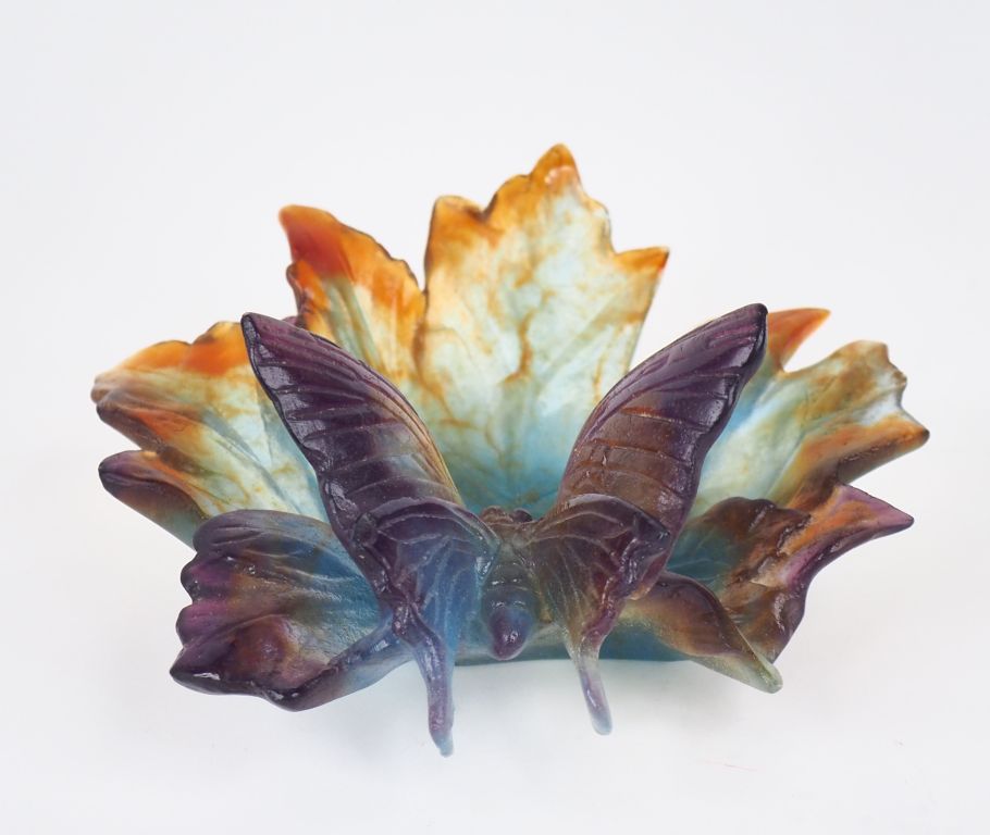 DAUM France. Sujet en pâte de verre polychrome à décor de papillon posé sur une feuille. Dim. 9 x 17 cm Signée