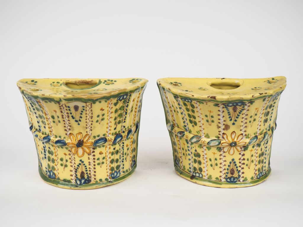 FAÏENCE DU MIDI. Paire de bouquetières évasées en faïence de grand feu à décor sur fond jaune de bandes polychromes de fleurs et motifs géométriques retenus par un lien fleuri. (restauration à l’une). Fin du XVIIIème siècle. H. : 14,8 cm , L. : 20,5 cm