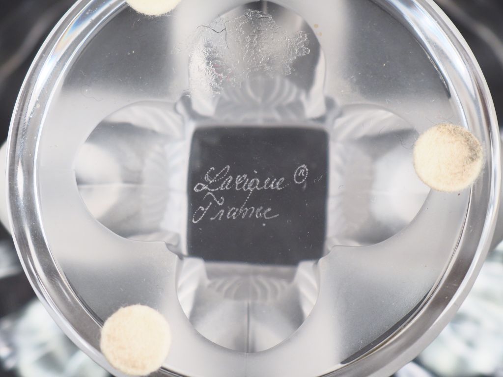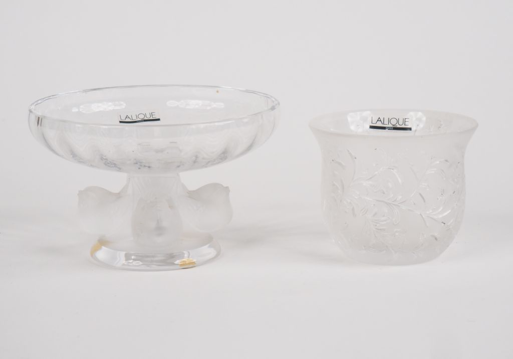 LALIQUE France. Coupelle en cristal le pied à décor de quatre moineaux et un gobelet en cristal moulé à décor de fleurs. H. 9 m, diam. 14 cm H. 8 cm