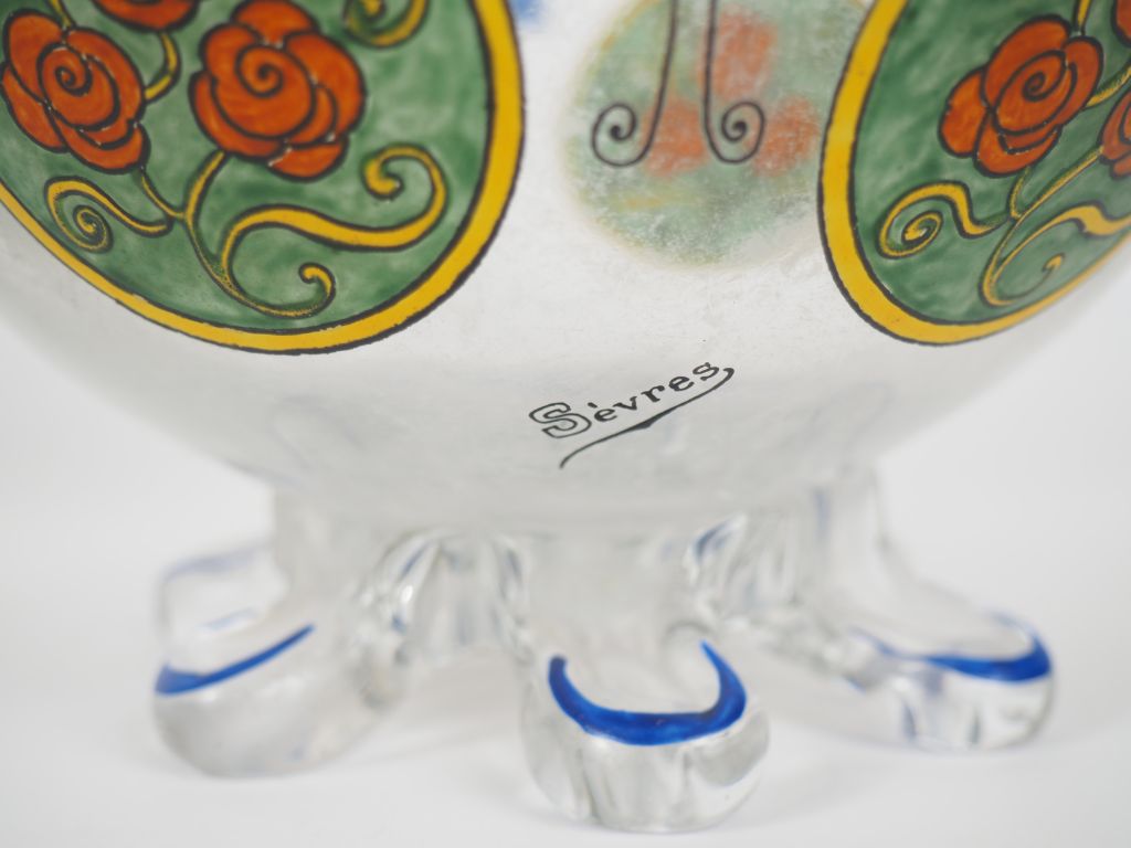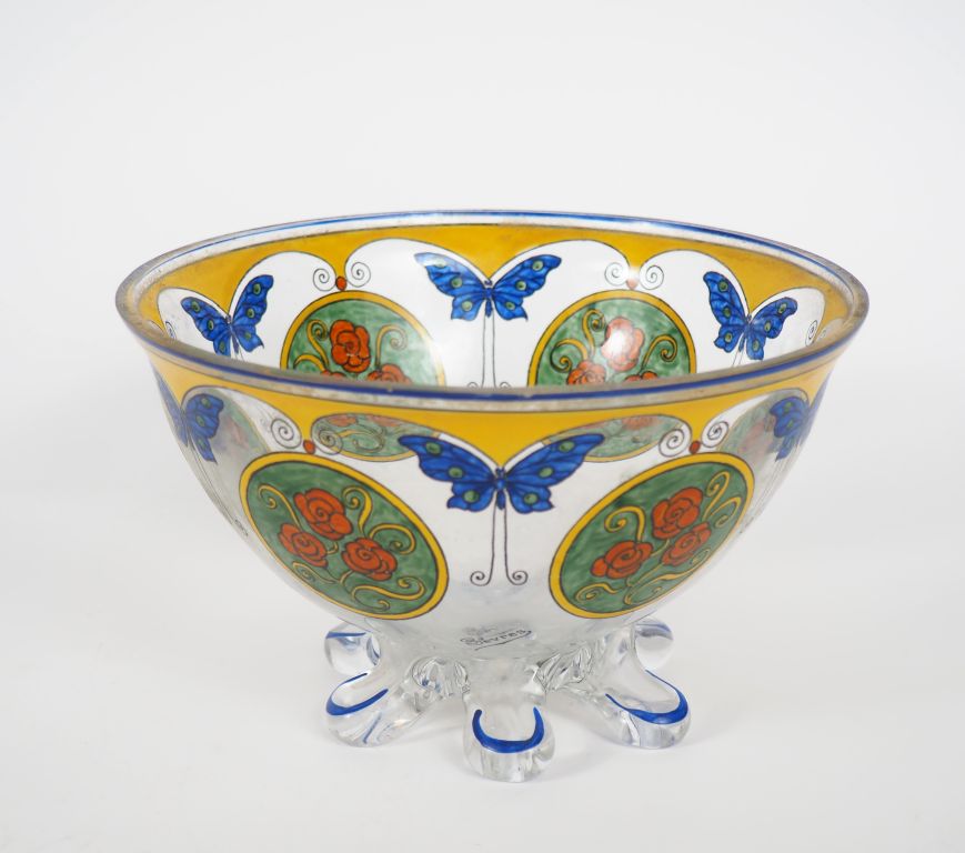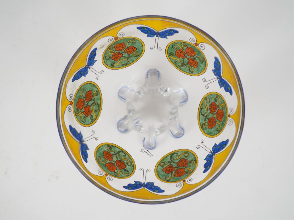 SEVRES. Coupe Art Déco en cristal émaillé, à décor polychrome de papillons et de roses dans des réserves. Signée H. 12 cm
