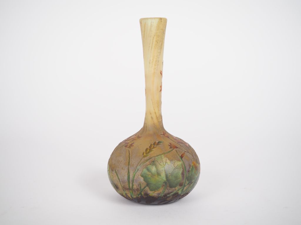 DAUM à Nancy. Vase soliflore à base pansue en verre multicouche à décor gravé en camée et dégagé à l'acide. Signé. H. 17 cm. (Signature partiellement éffacée).