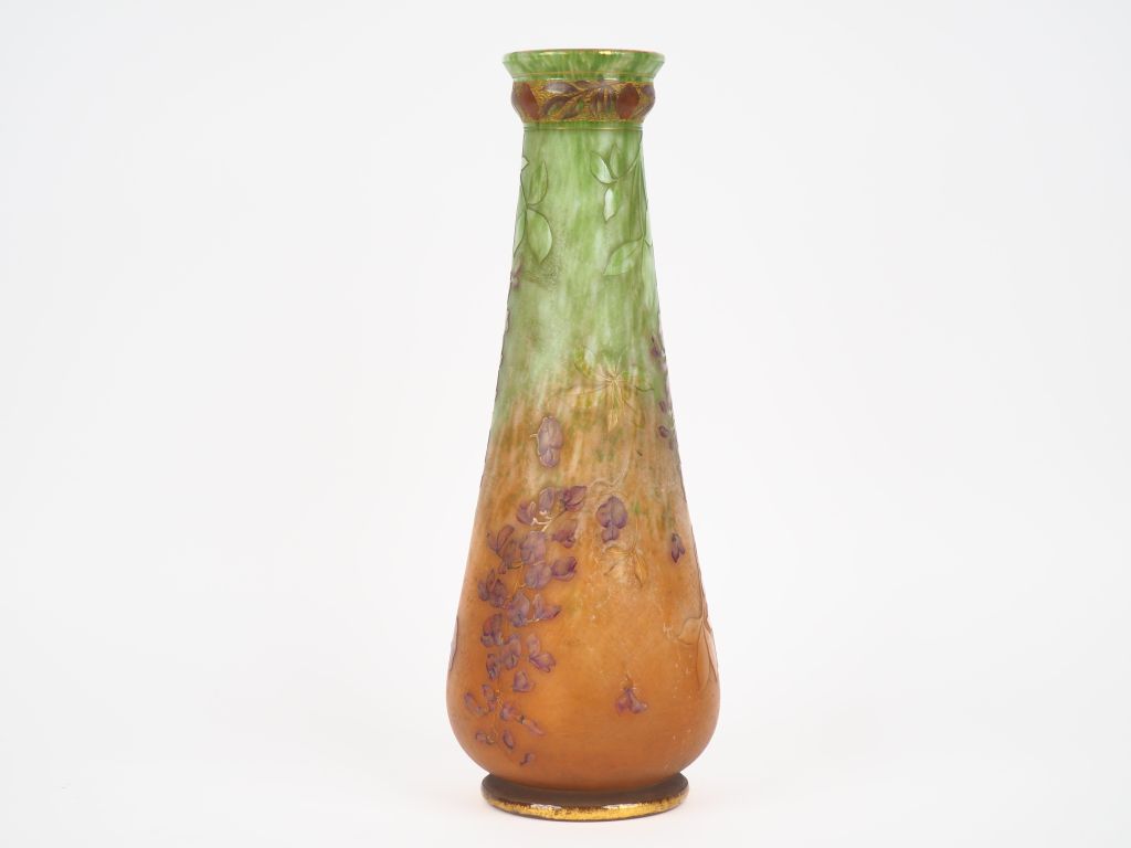DAUM. Grand vase balustre à décor gravé en camée à l'acide et émaillé de glycine rouge et mauve sur fond vert sur le haut et orangé sur le bas , une partie du décor est placée sur une bande à fond doré. Signé Daum à Nancy H. 51 cm