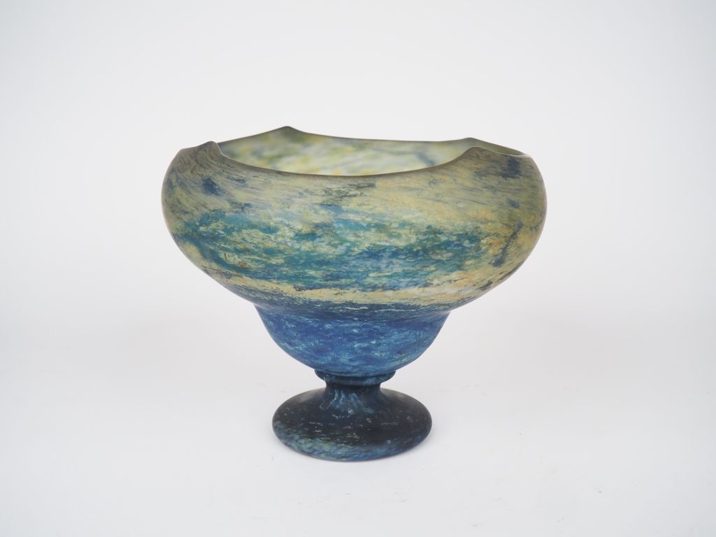 DAUM. Grande coupe sur pied en verre marbré bleu et jaune. Signée. H....