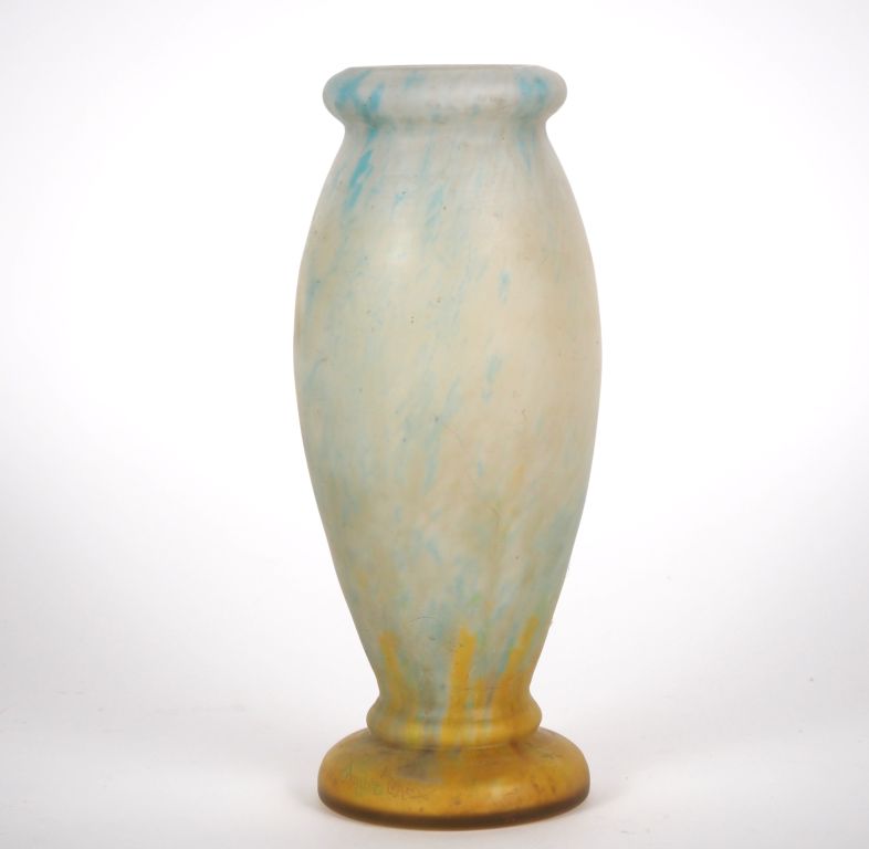 DAUM Nancy. Vase en verre multi-couche à décor moucheté bleu, blanc et jaune. Signé. H. 26,5 cm.
