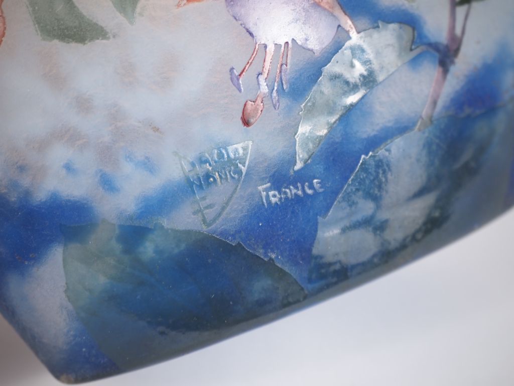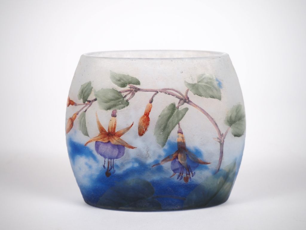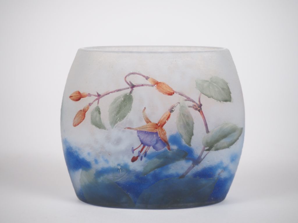DAUM Nancy. Vase ovoïde en verre multicouche à décor en camée et dégagé à l'acide de fuschias sur fond moucheté bleu et blanc. Signé. Dim. 10 x 11,5 x 6 cm. ( petite égrenure sous la base, petites bulles de cuisson)