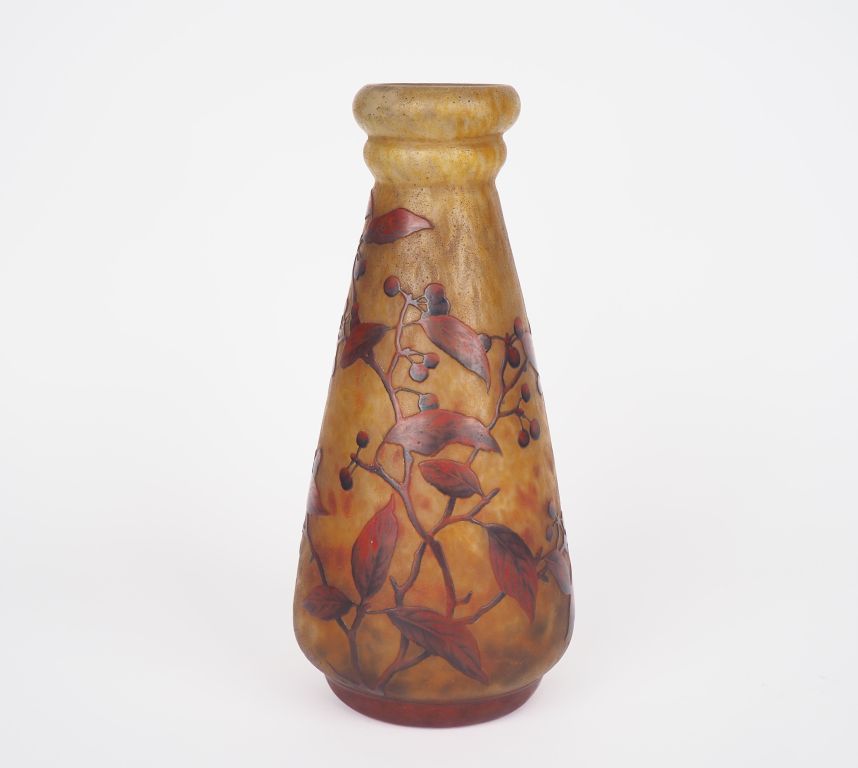 DAUM. Vase pansu en verre à décor gravé en camée et à l'acide de branchages et de baies rouges sur fond jaune. Signé H. 28,5 cm