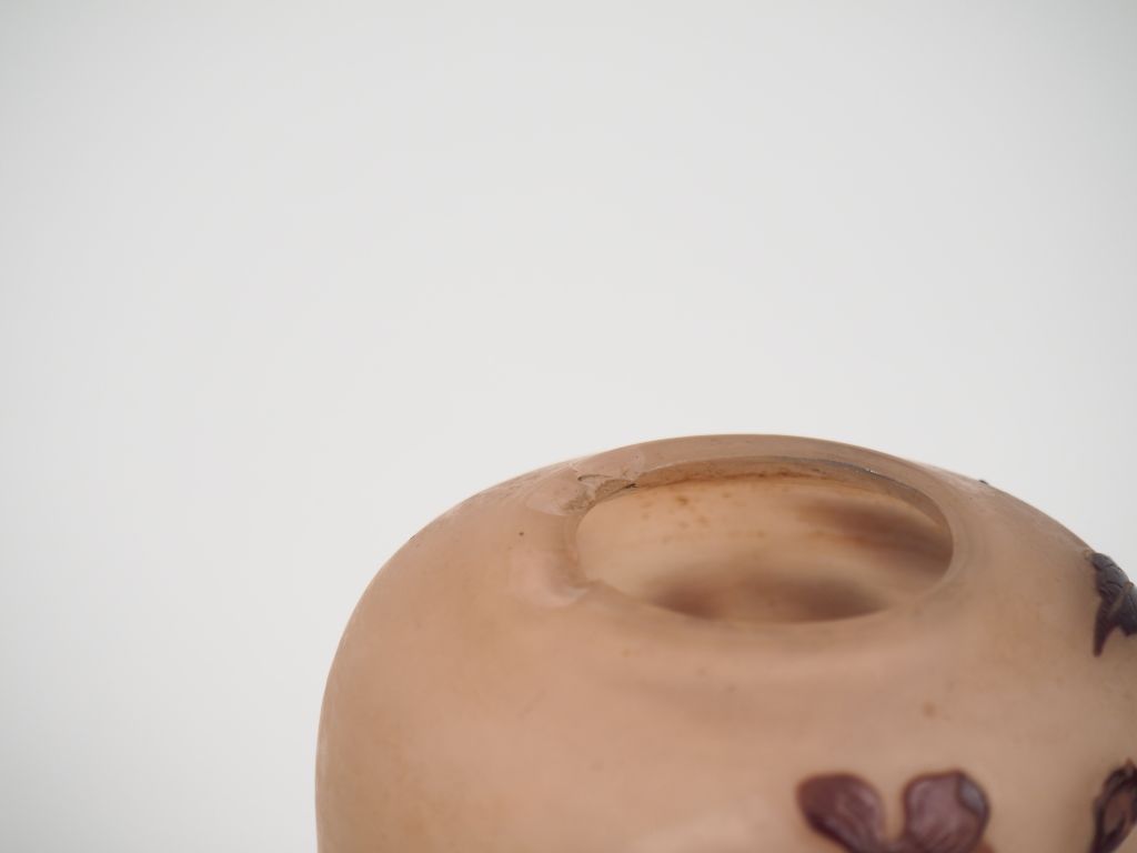 GALLE. Petit vase ovoïde en verre, à décor gravé en camée à l'acide de fleurs mauves sur fond blanc rosé. Signé. H. 12 cm (petites égrenures au col)