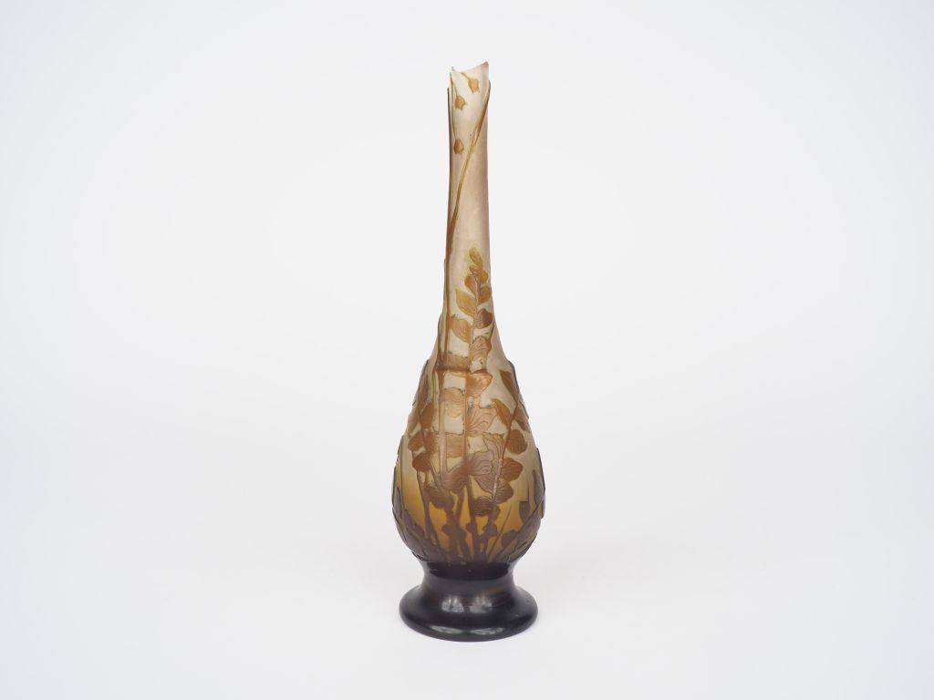 GALLE. Vase soliflore en verre, à décor gravé en camée et à l'acide de fleurs. H. 22.5 cm. (cassé au niveau du col).