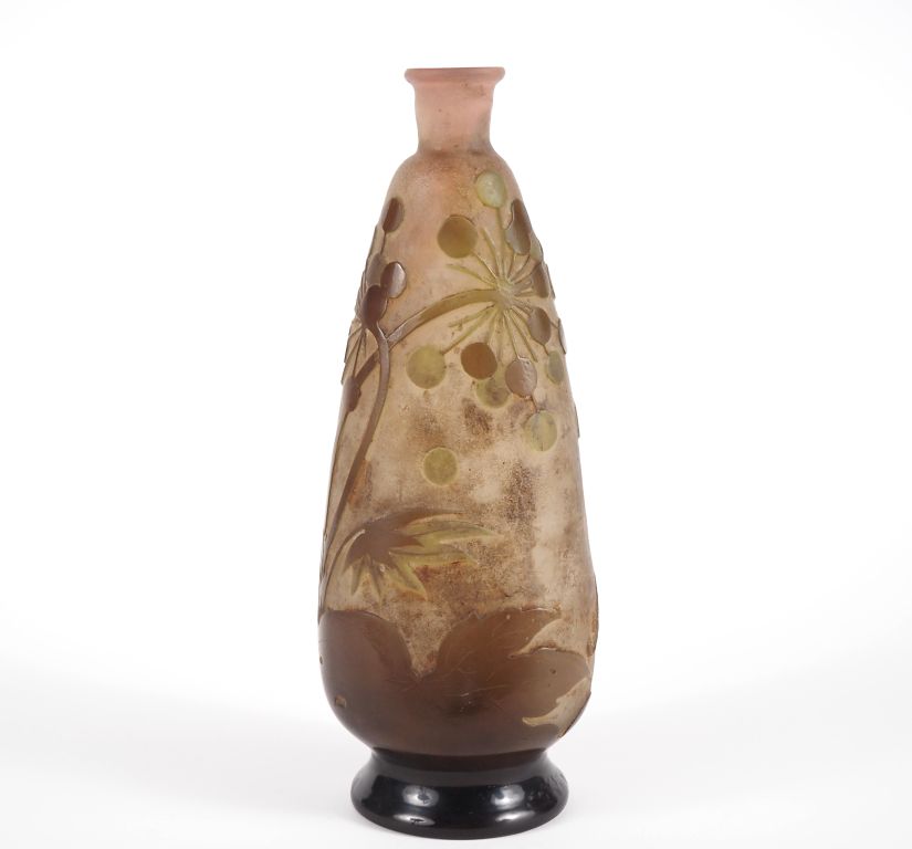 GALLE. Vase sur piédouche en verre à décor gravé en camée et dégagé à l'acide de feuillage et de fleurs. Signé. H. 25,5 cm.
