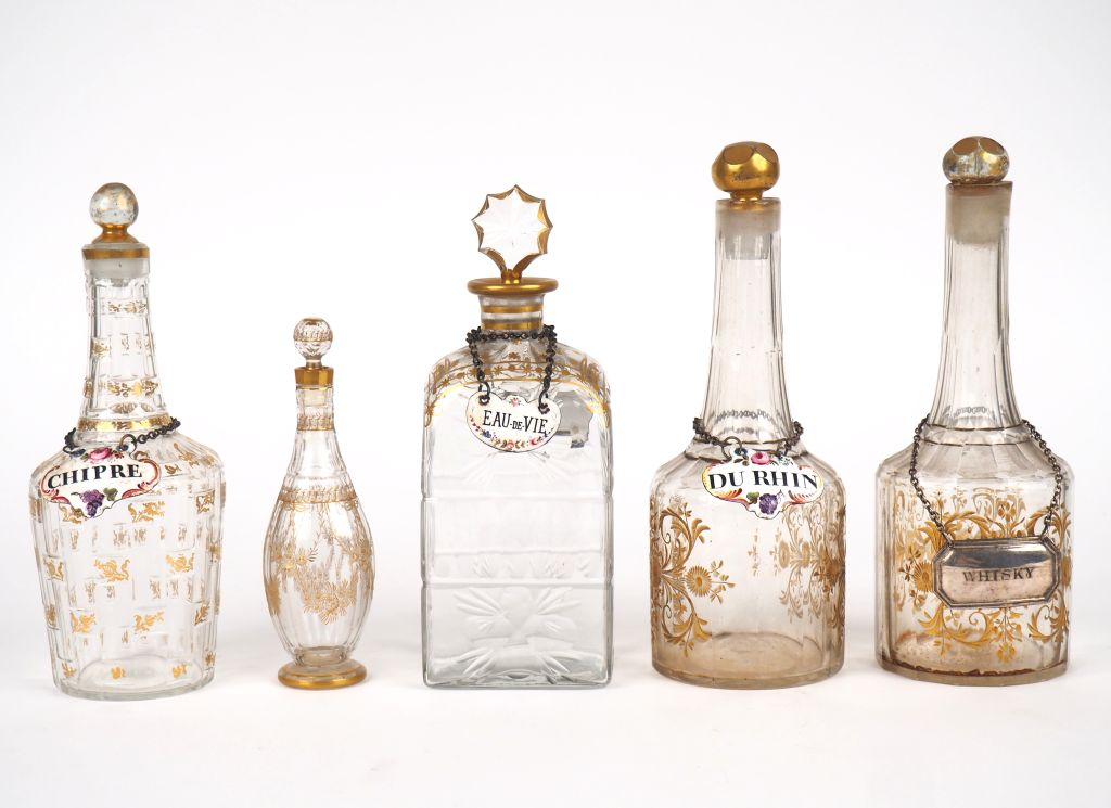 4 flacons à liqueur et un flacon à odeurs XIXème en verre à décor doré de rinceaux feuillagés et de fleurs. (Bouchons dépreillés).
