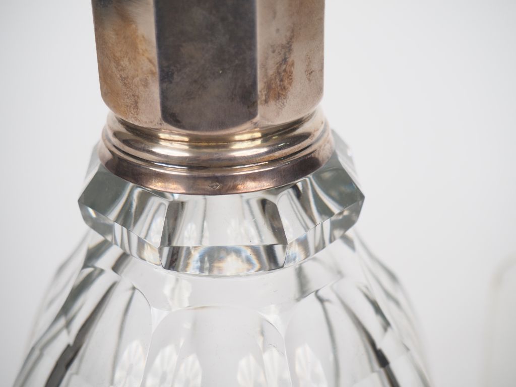 BACCARAT. 2 flacons, 1 boîte couverte, 1 verseuse, 1 petit flacon. L'ensemble en cristal et argent Signés. H. de 11 à 29 cm.