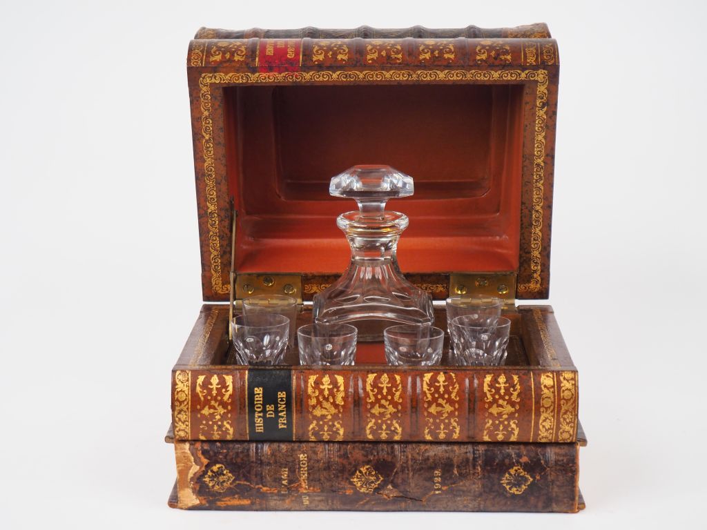 BACCARAT. Cave à liqueur 1900 en cristal, boite en trompe l'œil en forme de pile de livres. Signée. (petits accidents à la reliure) 23 x 28 x 20 cm
