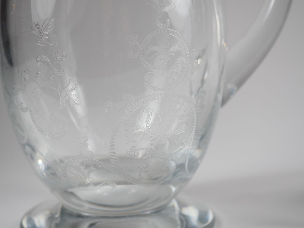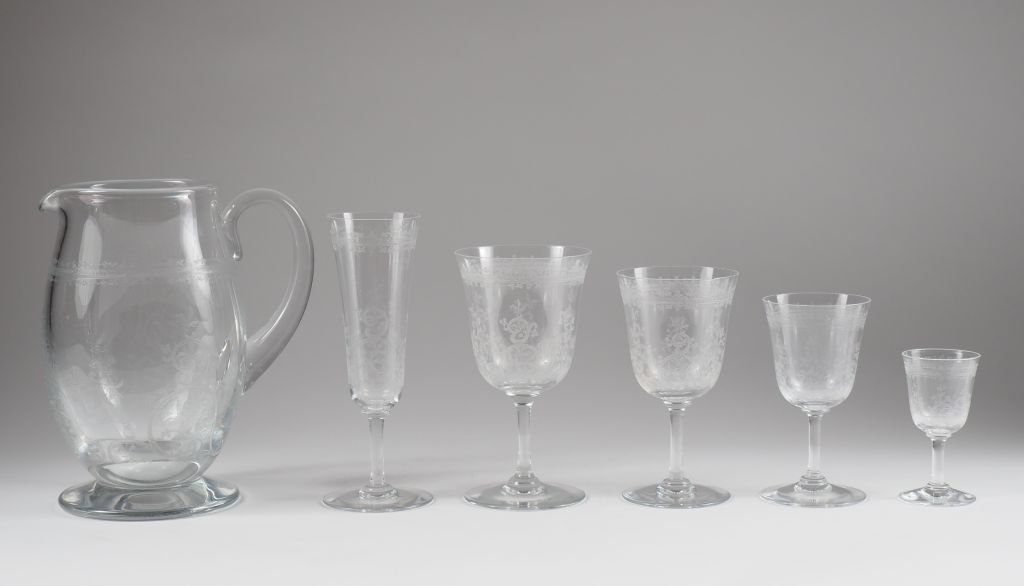 BACCARAT. Service de verres en cristal gravé à décor de feuillage : une carafe 8 verres à eau 7 verres à vin rouge 5 verres à Sauternes 8 flutes à champagne 5 verres à porto