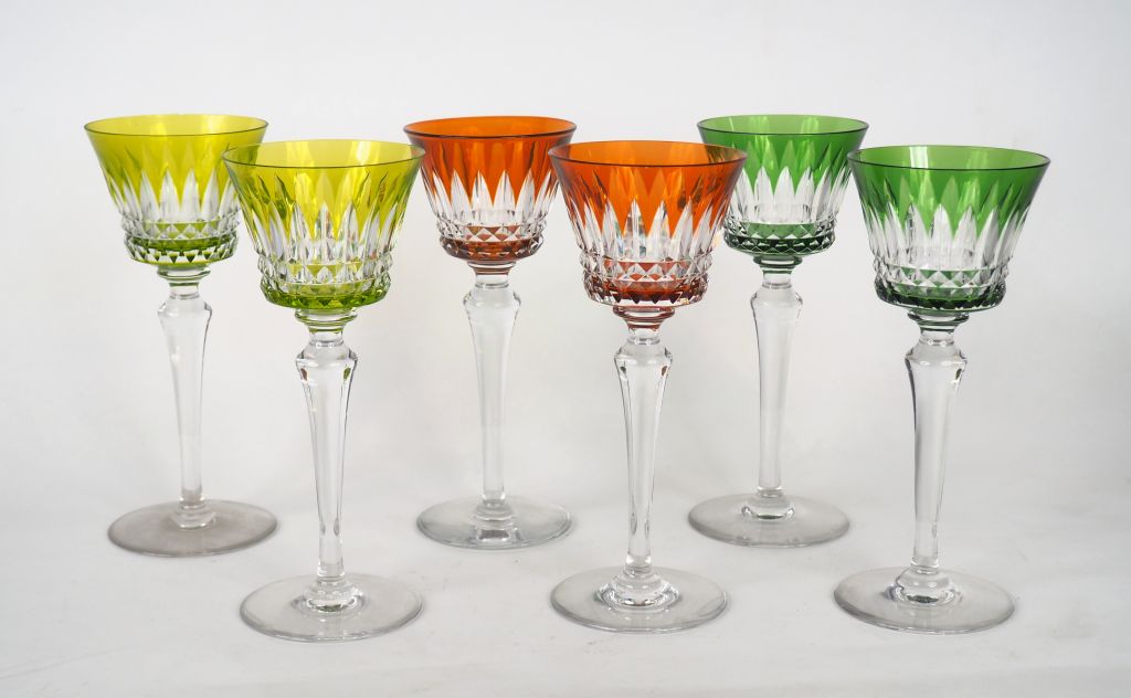Lot de BACCARAT. Six verres à vin du Rhin en cristal polychrome. Signés. (é au prix de 60 à 80 € en vente aux enchères par l'hôtel des ventes Primardeco
