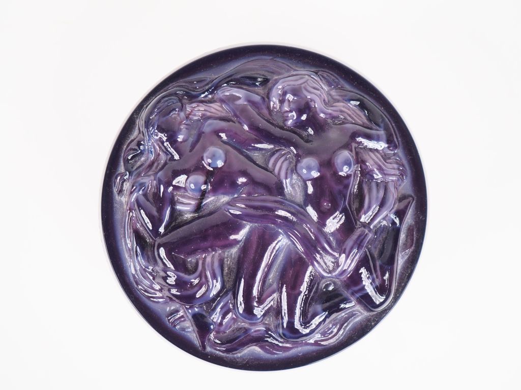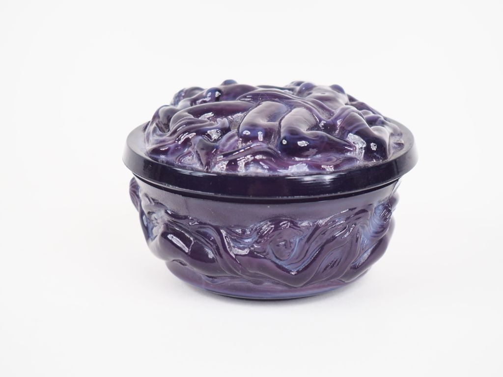 Boite couverte en verre mêlé violine à décor de naïades. H. 6 cm - Di...