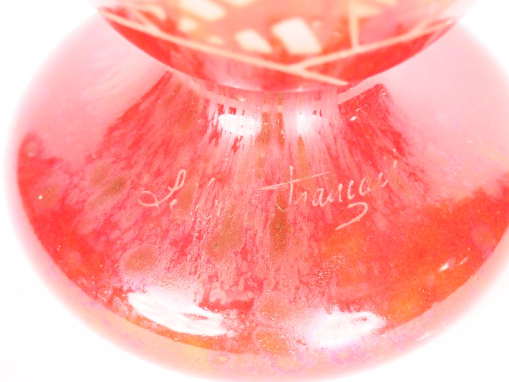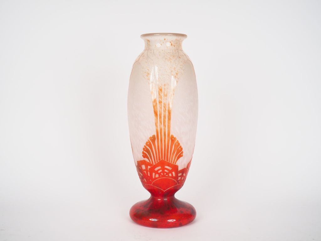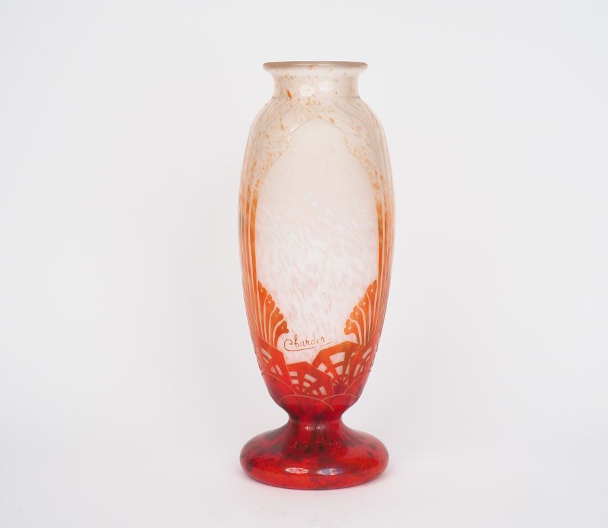 CHARDER, LE VERRE FRANCAIS. Vase "Algues" en verre à décor gravé en caméee à l'acide sur fond moucheté blanc et rouge orangé. Signé. H. 42 cm.