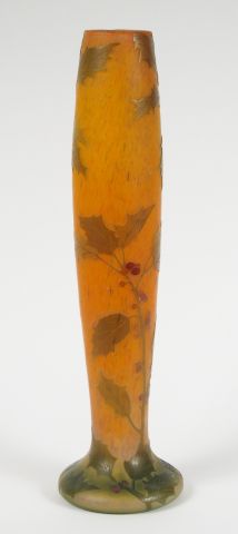 Lot de DAUM. Vase en verre, à décor gravé et émaillé de houx sur fond orangé. au prix de 800 à 1200 € en vente aux enchères par l'hôtel des ventes Primardeco