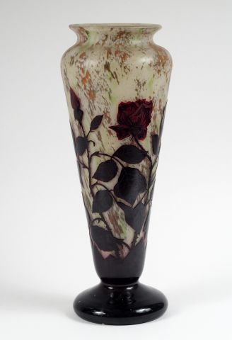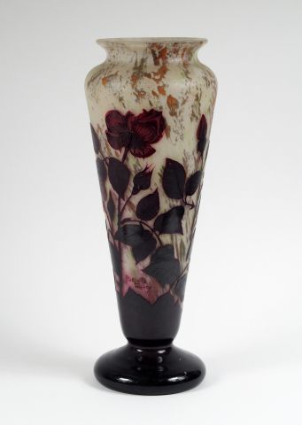 DELATTE. Grand vase en verre, à décor gravé en camée et à l'acide de roses pourpres sur fond beige moucheté de blanc, vert et orange. Signé. H. : 43,2 cm