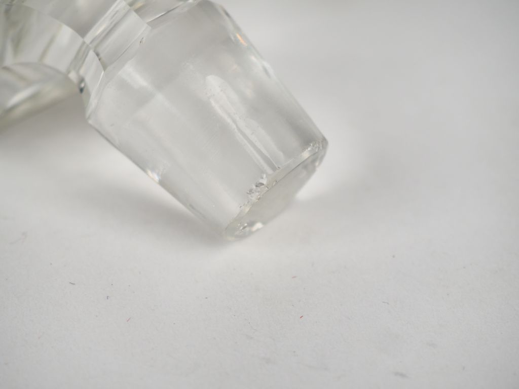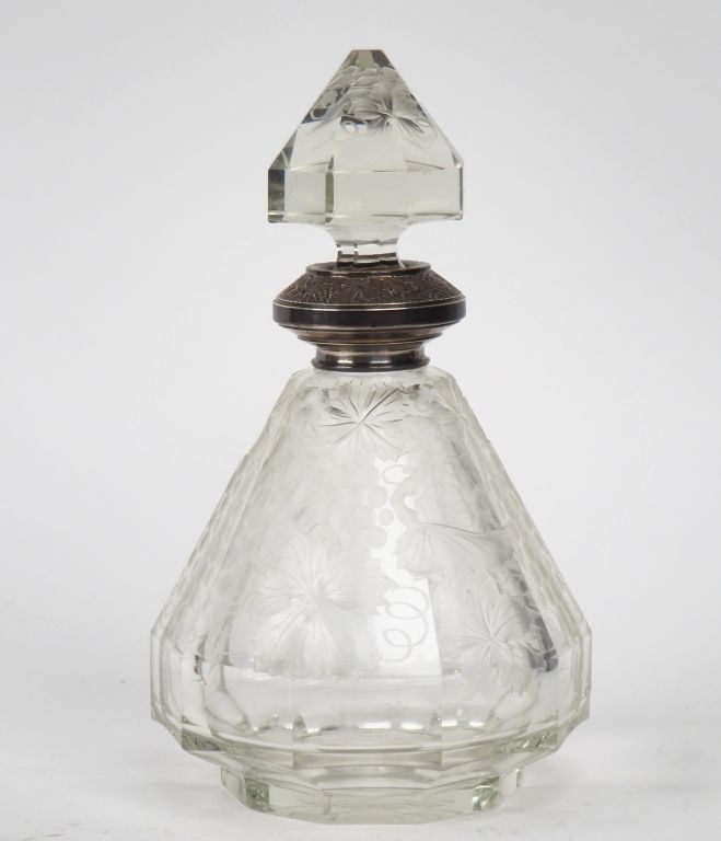 Flacon 1900 en cristal gravé à décor de pampres , monture en argent poinçon Minerve. (égrenure sur le bouchon). H. 26 cm