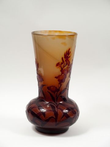 GALLE. Grand vase en verre, à décor gravé en camée et à l'acide et lustré de fleurs en camaïeu orange et brun. Signature japonisante. H. : 42 cm