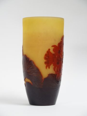 GALLE. Vase en verre, à décor gravé en camée et à l'acide de fleurs rouges sur fond jaune. H. : 24,5 cm. Signé.