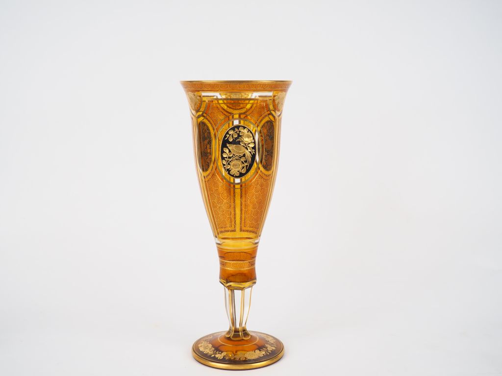 Grand vase sur piédouche en cristal ambré et doré, à décor d'oiseaux et de fleurs dans des réserves. H. 31 cm