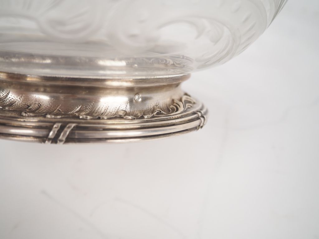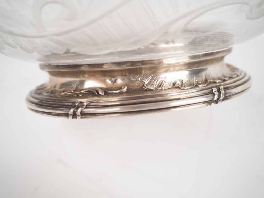 Jatte 1900 en cristal gravé et argent, poinçon Minerve, à décor de feuillage, de fleurs et de rocailles. H. 10,5 cm diam. 22 cm