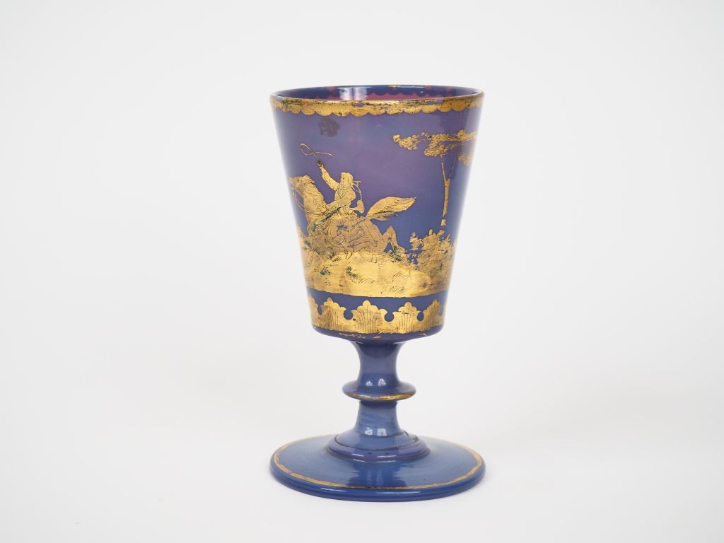 Mazagran XIXème en opaline mauve à décor doré de scène de chasse à courre. H. 15 cm