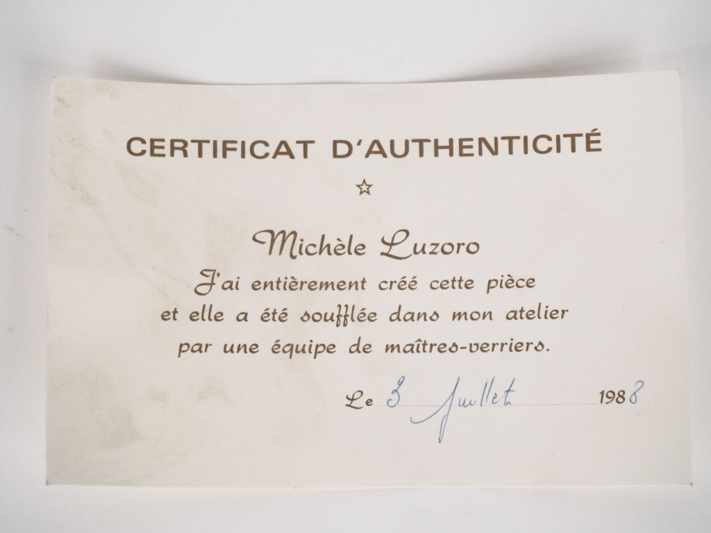 Michèle LUZORO. Vase en verre soufflé à décor mêlé. Signé et accompagné de son certificat d'authenticité daté 1988. H. 30,5 cm.