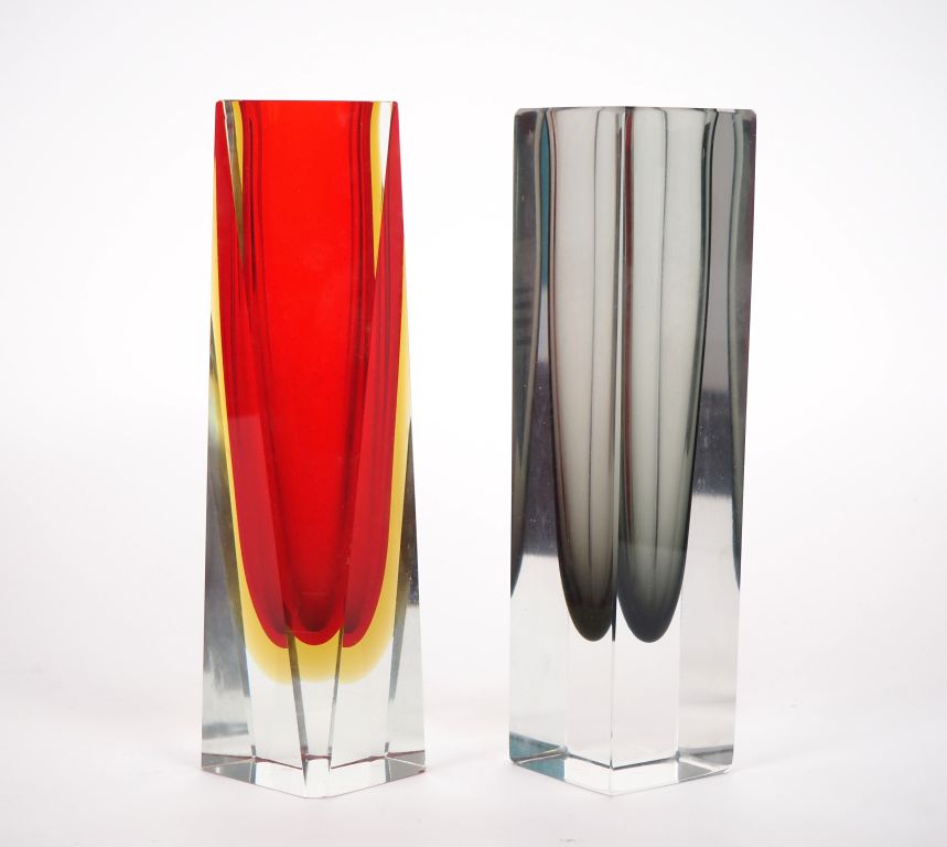 MURANO. Deux différents vases en verre bicolore années 60. H. 25,5 cm. (Egrenure à la base de l'un)