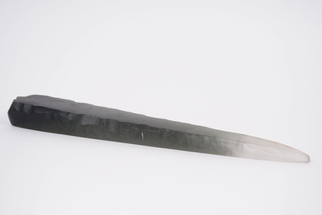 NANCY France. Presse papier en pâte de verre brune en forme de hache préhistorique. L. 35 cm (petite égrenure)