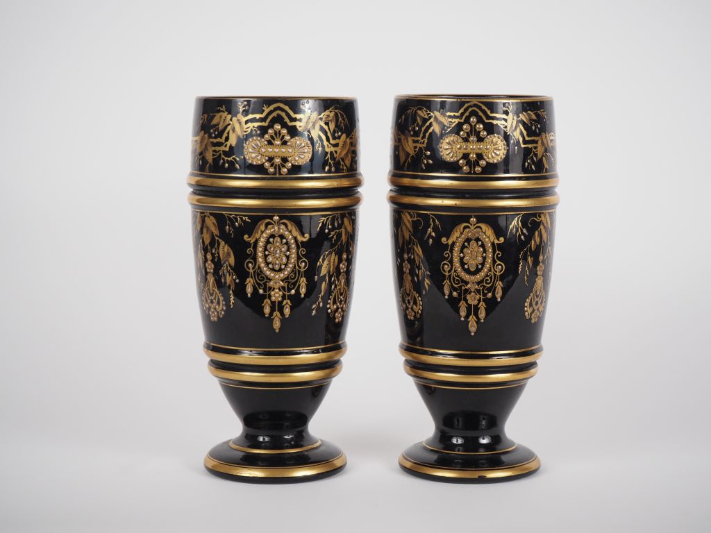 Paire de vases Napoléon III en cristal noir, décor émaillé et doré de motifs feuillagés. H. 25,5 cm