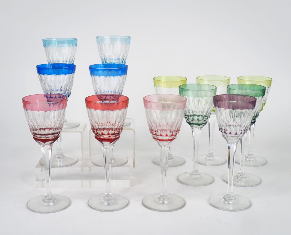 Partie de service de verres à vin du Rhin en cristal bicolore comprenant 13 verres. On y joint 4 verres en cristal bicolore de Saint-Louis.