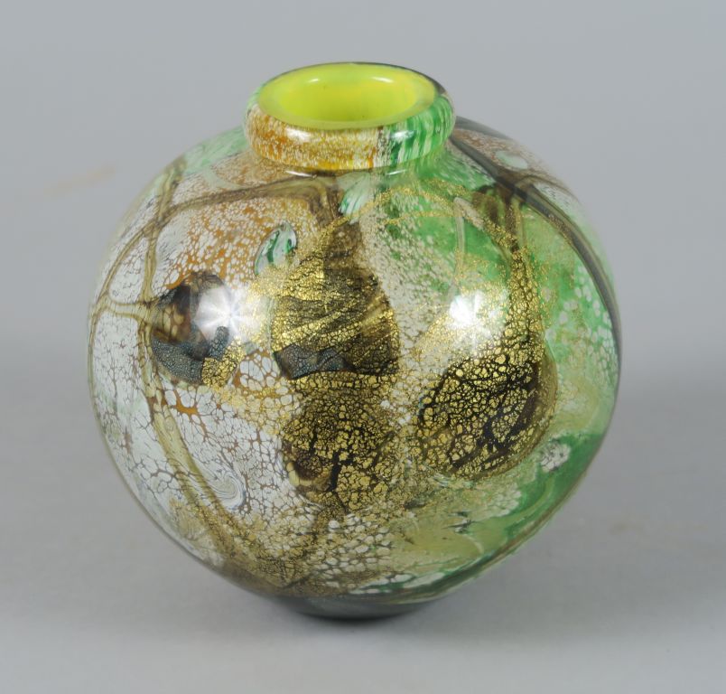 Raymond BRANLÉ. Vase ovoïde en verre, à décor de motif floral stylisé et inclusions d'oxydes métalliques. Signé et daté 1991. H. 12 cm