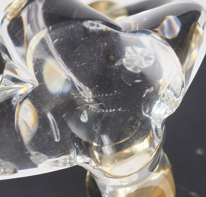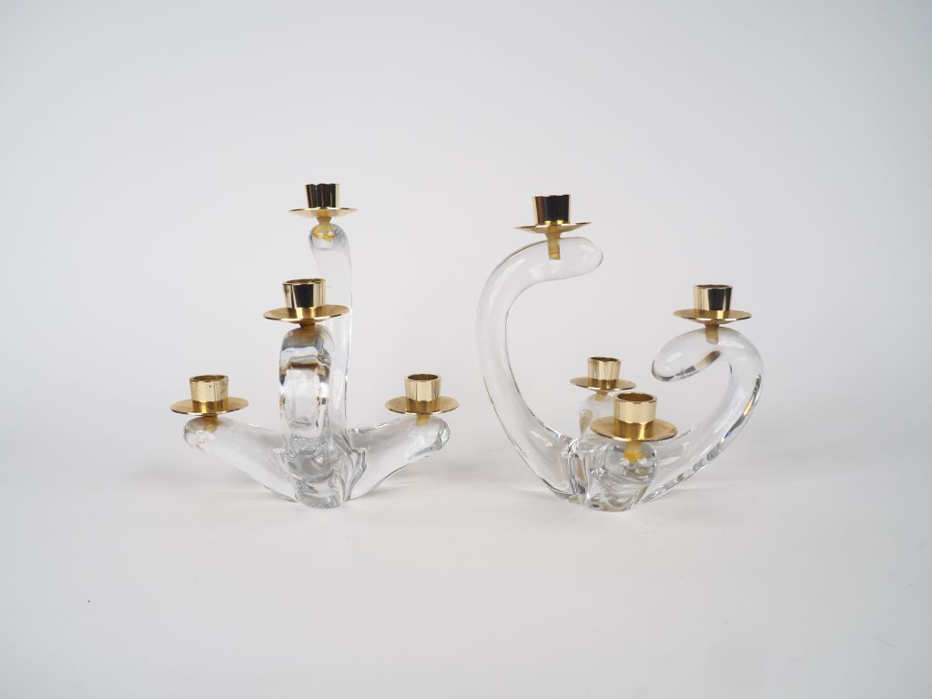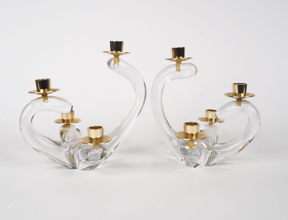 SCHNEIDER. Paire de bougeoirs de table en cristal et métal doré éclairant à trois lumières. Signés. Dim. 21 x 22 x 19 cm.