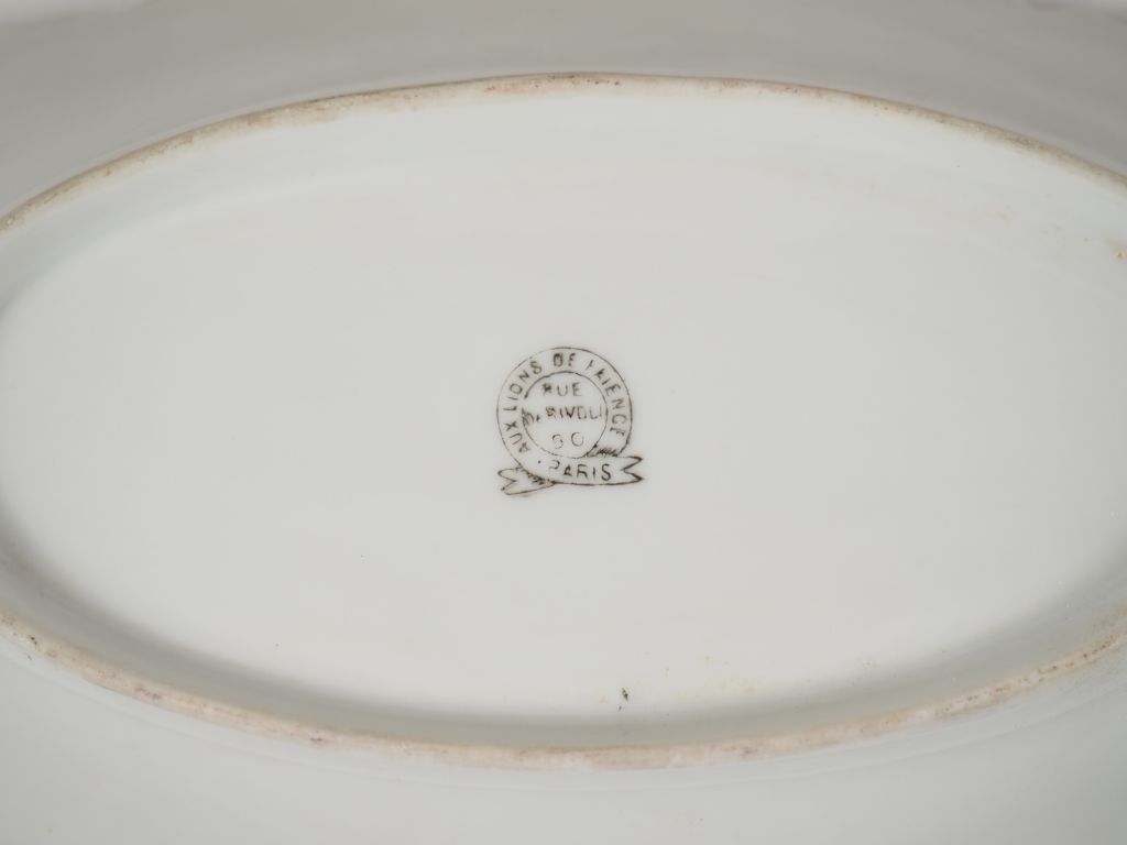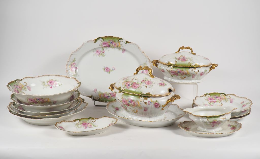 Service de table 1900 en porcelaine de Limoges à décor de roses sur fond blanc rehaussé de vert et de doré. (égrenures)
