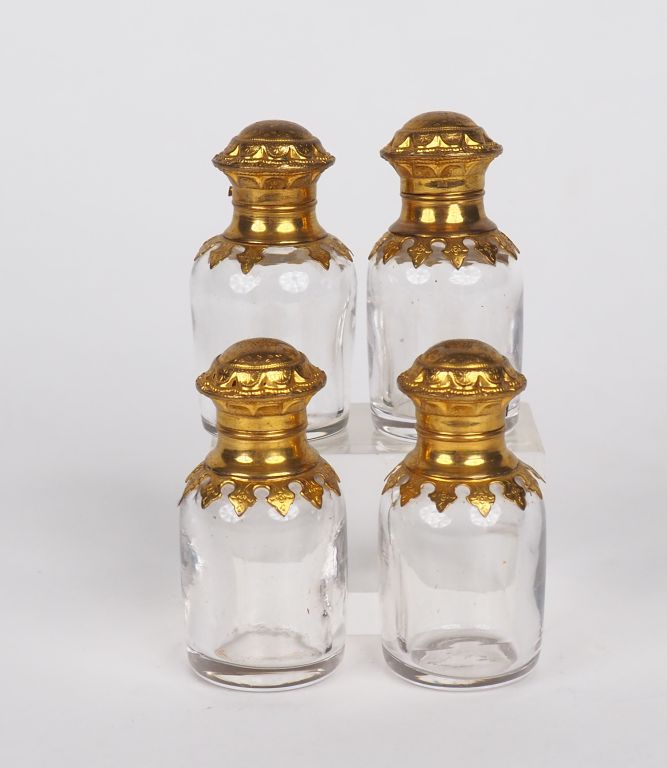 Suite de quatre flacons à odeurs en cristal et pomponne.