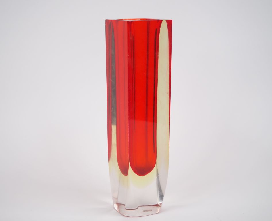 Lot de Vase en verre de Murano rouge et translucide. H. 30 cm (micro égrenur au prix de 50 à 80 € en vente aux enchères par l'hôtel des ventes Primardeco