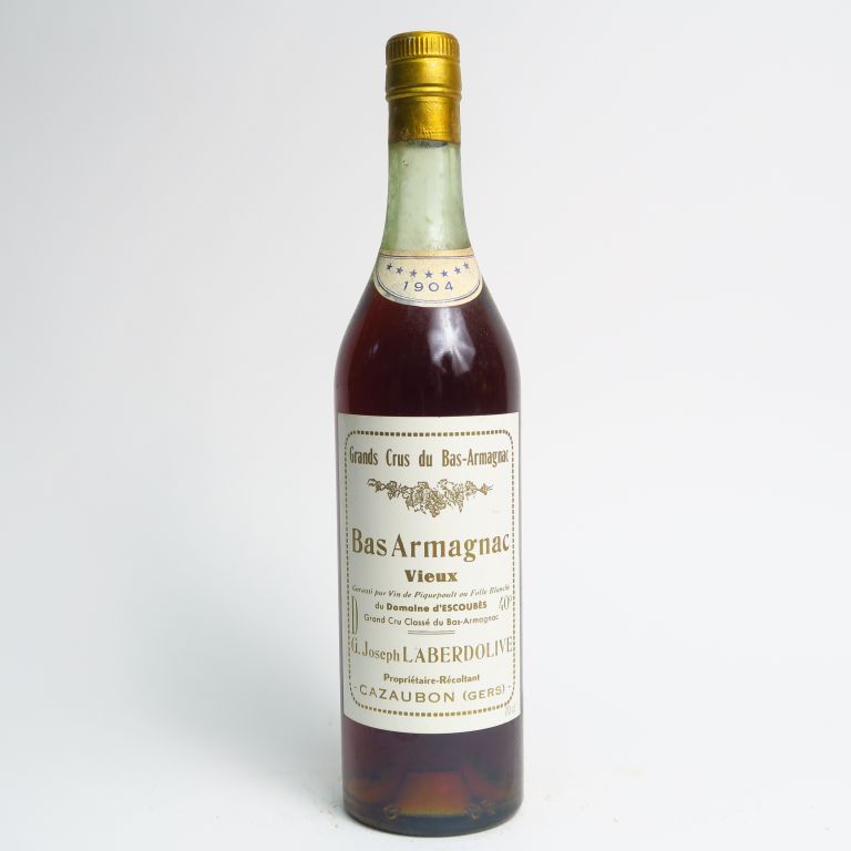 Lot de 1 BOUTEILLE BAS ARMAGNAC DOMAINE D'ESCOUBES JOSEPH LABERDOLIVE - 1904 au prix de 1000 à 1200 € en vente aux enchères par l'hôtel des ventes Primardeco