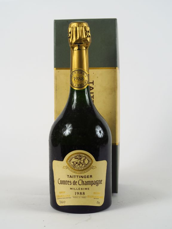 Lot de 1 BOUTEILLE CHAMPAGNE TAITTINGER COMTES DE CHAMPAGNE - 1988 - COFFRET au prix de 120 à 150 € en vente aux enchères par l'hôtel des ventes Primardeco