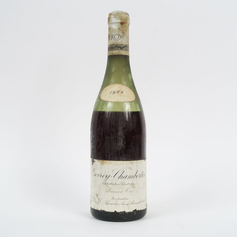 Lot de 1 BOUTEILLE GEVREY CHAMBERTIN 1er CRU LEROY - 1962 - 8 CM/CAPS AB/EA au prix de 90 à 110 € en vente aux enchères par l'hôtel des ventes Primardeco