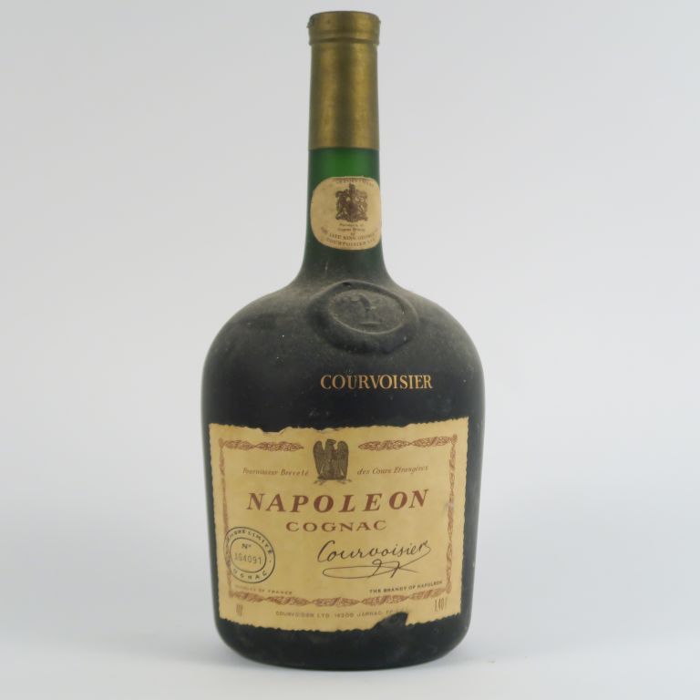 Lot de 1 VIEUX FLACON (1,4 L) COGNAC COURVOISIER 'NAPOLÉON' - CAPS DÉCOUPÉE/E au prix de 50 à 60 € en vente aux enchères par l'hôtel des ventes Primardeco