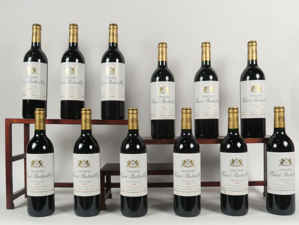 Lot de 12 BOUTEILLES CHÂTEAU HAUT BATAILLEY GCC PAUILLAC - 1993 - CBO - 1 ETL au prix de 150 à 160 € en vente aux enchères par l'hôtel des ventes Primardeco