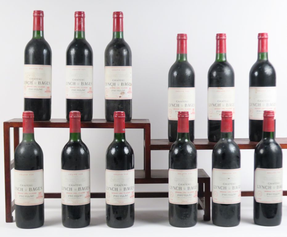 Lot de 12 BOUTEILLES CHÂTEAU LYNCH BAGES GCC PAUILLAC - 1988 - 10 BG/2LB/1ELT au prix de 900 à 1000 € en vente aux enchères par l'hôtel des ventes Primardeco