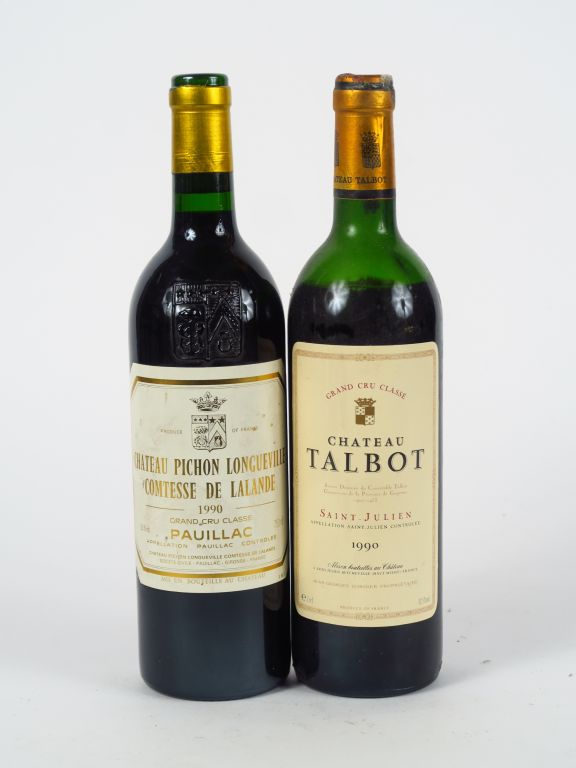 2 BOUTEILLES 1990 : 1 CHÂTEAU PICHON LONGUEVILLE COMTESSE DE LALANDE GCC PAUILLAC CAPS DECOUPEE - 1 CHÂTEAU TALBOT GCC ST JULIEN BEP/COULEUSE